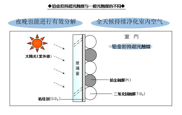 涂上空氣戰略鉑金擔持超光觸媒后、玻璃表面上附著著由二氧化鈦觸媒和鉑金觸媒組成的[鉑金二氧化鈦超光觸媒]以及使其固定在玻璃上的粘結劑。鉑金擔持超光觸媒通過太陽光中紫外線的照射,充分達到分解效果。所以將其涂抹于太陽光照射量最多的玻璃上時,能使其達到最大的分解效果。鉑金擔持超光